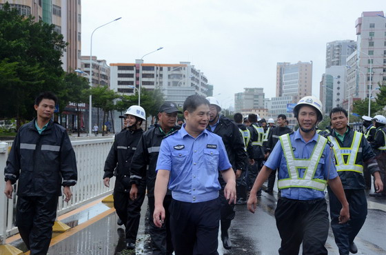 王中副局长来到交警赤坎大队督导防风工作。