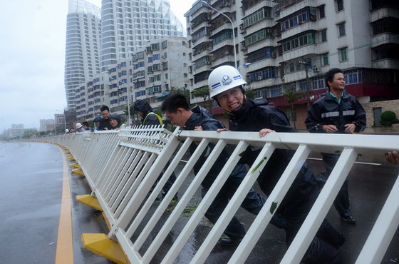 为了快速应对台风引发的各种紧急情况,交警赤坎大队全员在大队进行24小时的防风应急待命。陈向大队长坐镇大队指挥部,全面负责统筹调度,通过全盘掌握和快速调配警力,确保辖区各重点、要点,险情重的路段得到“第一时间”的化解,及时恢复道路的畅通。7月19日6时许,风力稍弱,赵文科教导员、李志翔副大队长、何彤彤副大队长带领梁航中队长,石红伟指导员,李伟林指导员等中队股领导和民警、协管员立即展开了道路清障抢险工作,用砍刀、斧头等工具及时清除挡路的障碍。期间,海滨大道北多处护栏被风刮倒在地,吴小明支队长带领交警赤坎大队领导、民警和协管员,冒着风雨,全力抢救,因护栏太长、太重,吴小明支队长带领大家以“滚动接力推扶”的方式,不停歇地扶起约800多米倒地的护栏。同时,赤坎交警通过官方微博及时发布赤坎道路交通状况,对外宣传赤坎交警的抗风抢险工作,展现公安交警在防御台风中的良好形象,进一步加强了警民互动。