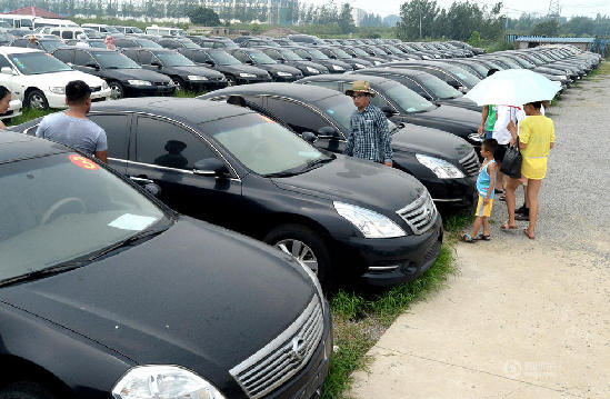 7月20日,市民在山东枣庄一家拍卖公司场地上查看待拍公车。当日,标有序号的103辆公车整齐地停放在山东枣庄一处拍卖公司场地上,许多市民冒着酷暑前来查看。山东省枣庄市党政机关的103辆公务用车将于7月23日至25日在中国拍卖行业协会网络平台的5个大厅进行公开拍卖,如此大规模的政府公车拍卖在山东属首次。新华社记者 冯杰 摄