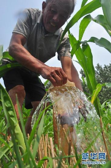 山东省聊城市茌平县贾寨镇农民给干枯的玉米浇水。 6月份以来,山东省降水量比历年同期偏少近五成,加之持续高温晴热天气,致使旱情迅速蔓延发展。截至7月18日,山东8500多万亩农作物中有1282万亩在田作物受旱,50余万人出现临时性饮水困难,山东已于18日启动抗旱三级应急响应,多地采取行动积极抗旱。