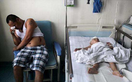 昨日下午4时许,受伤的乐乐仍在昏迷中,她的头上裹着厚厚的绷带。据唐都医院神经内科的值班医生介绍,乐乐目前仍未脱离生命危险,她的头部受重创,造成头骨骨折,颅内有出血现象,如果继续出血就需要做开颅手术。一直照顾女儿的安某除了右手被划伤外,他的左臂、肩部、腹部都有淤青。妻子左臂有划伤,身上多处淤青。黄利健 摄