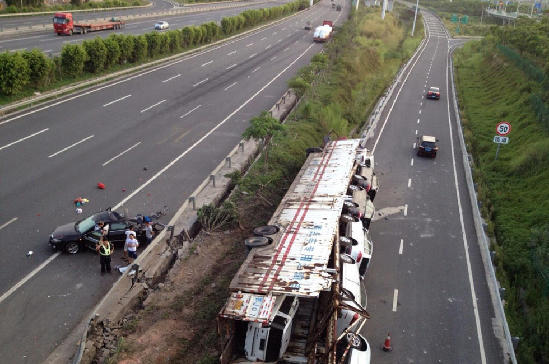 厦门长挂车追尾侧翻 玛莎拉蒂等11辆豪车掉落
