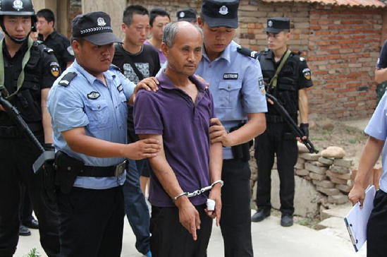 男子刺死邻居一家四口被捕 戴手铐向围观群众招手