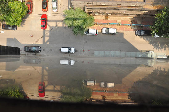 图为当天记者前往事发医院大楼采访。红点处就是郭伟坠落处。