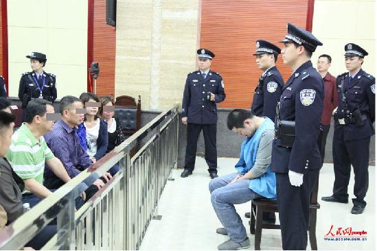 7月22日,经最高人民法院核准,广西壮族自治区贵港市中级人民法院依法对酒后枪杀孕妇的原平南县刑侦大队民警胡平执行了死刑。图为4月1日,二审庭审结束后,法庭安排胡平和家属见面,交谈中他低下头哭了。