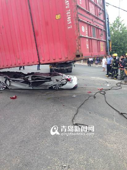 青岛轿车被压扁 消防营救车内两人全程