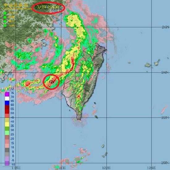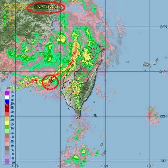这张是飞机高雄起飞时的雷达回波图,由台湾的气象局网站公布,可以明显看到在马公的上空是一片红色--雷雨孢笼罩在马公上空。
