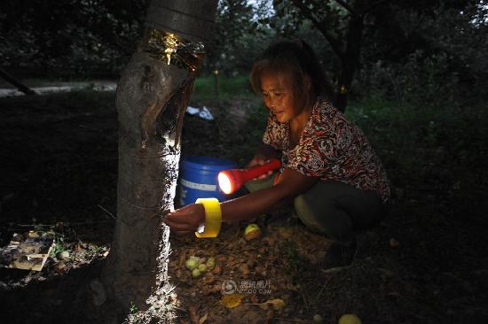 2014年7月26日,山西临猗,村民们打着手电筒在苹果园里捕抓金蝉。进入七月份以来,在种植着80万亩苹果树的“果乡”临猗县,果农们白天在果园劳作,一到晚上,老人孩子纷纷拿着照明工具和小桶到果园捕抓金蝉。本组摄影:刘宝成/CFP