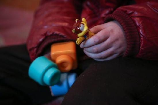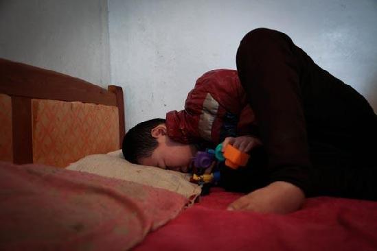 2014年3月11日,山东临沂,李致康疲惫地蜷缩在床上,手里拿着他最喜欢的玩具,他每天几乎所有的时间都在这张床上渡过。澎湃新闻 兰卉图