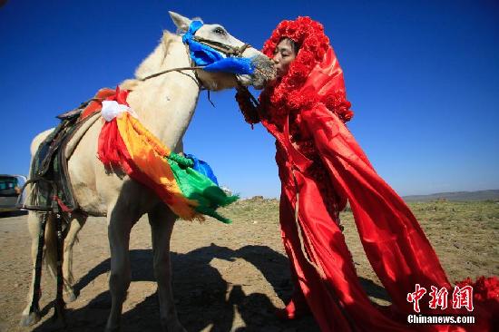 7月26日,艺术家孔宁在内蒙古与马举行婚礼,为其历经十天的行为艺术《嫁达茂蒙古马》画上完美句号,并成功将其亲手制作的婚纱作品“萨如拉红宝石”献给蒙古马和大草原。吃苦、耐劳、坚韧、勇敢是蒙古马的精神也是草原精神。图为孔宁亲吻爱马。
