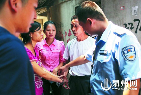 在“岳父”老潘的眼里,黑龙是个混混,在安永德一带颇有凶名。而女儿小云,是17岁那年被黑龙骗走的。17岁的小云还在上高中。老潘不清楚两人是如何认识的,他只知道两人刚认识第一天就一起去了泉州,开了房。半个月后,小云才吞吞吐吐地告诉他以上的事。老潘说,虽然没有明媒正娶,但伴随着第一个外孙女的出生,这一段“婚姻”也变得顺理成章。起初,黑龙对待妻子和她的娘家人还算一般,但自从小云没能生下儿子,他就感觉在兄弟面前很没面子。每逢酒醉心情不好,黑龙便对小云拳脚相向。小云总是选择忍气吞声,曾向父亲老潘诉苦,称王某荣抓着她的头去撞墙,拿凳子砸她,前几年在南安诗山时,有一次还把她打得后脑出血,缝了14针。家里人如果劝架,就会被他威胁。图为被带来指认现场时,犯罪嫌疑人小云握着父亲的手,哭泣不止。