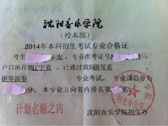 而家长们表示,辽宁省教育厅所谓下发的通知并没有及时告知沈阳音乐学院与考生和家长,严重耽误考生的正常报考,现造成报考沈音的近二百名通过分数线的考生无法被录取,无处可去。图为家长出示的文件。