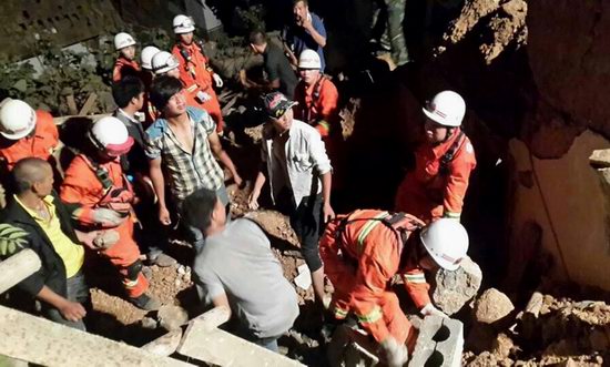 8月3日,救援人员在云南鲁甸县地震现场开展救援工作(手机拍摄)。