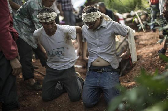 在司仪的指导下,两个儿子背对着跪下,感谢母亲的养育之恩。(冯海泳摄)