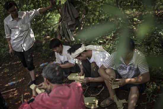 亲属坐在花椒树旁整理冥币,王金秀就是因为在地震时打理自己五亩地的花椒林不幸因山体滑坡而被埋。(冯海泳摄)