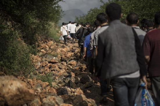 山上多处出现塌方和路面裂痕,村民小心翼翼将棺材运至事先定好的墓碑的位置。(冯海泳摄)