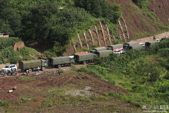 通往鲁甸震中龙头山镇的唯一道路受损,道路拥堵,大批救援车辆行驶缓慢。
