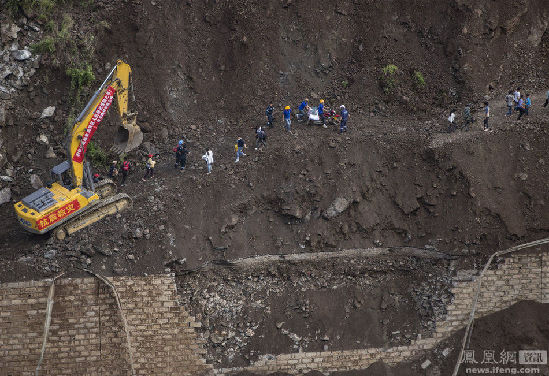 灾区的交通严重堵塞,鲁甸通往巧家的道路依然遭遇严重塌方,过往人员快速通过。