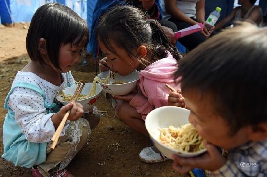 8月6日,云南昭通鲁甸地震震中龙头山镇,救灾帐篷前孩子们凑在一起吃面。截至8月6日10时30分,云南昭通鲁甸地震已造成589人死亡,9人失踪。“黄金救援72小时”已过,但救援行动仍在推进,震区民众的生活有所改善。今天下午,经过武警交通五支队昼夜奋战,由巧家县通往震中鲁甸县龙头山镇的救援通道打通,通往重灾区龙头山镇又多了一条人员救援和物资运送通道。生活仍在继续……