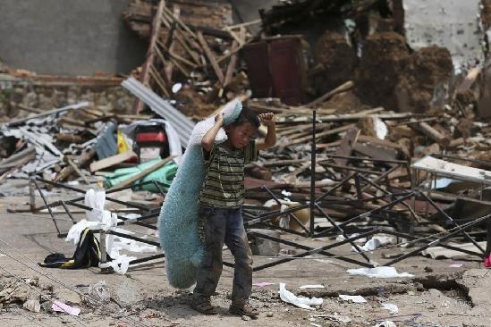 8月6日,云南昭通鲁甸地震震中龙头山镇,一名小男孩背着一只毛绒海豚玩具走过坍塌的房屋。