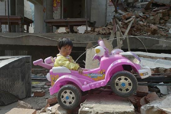 8月5日,龙头山镇老街,一名小孩坐在废墟中一辆玩具汽车上玩耍。