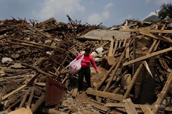 8月6日,云南鲁甸龙头山镇,妇女在废墟中收集着可用的家用物品。