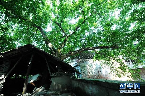 8月6日,一位市民在屋顶上观看黄葛树的生长情况。