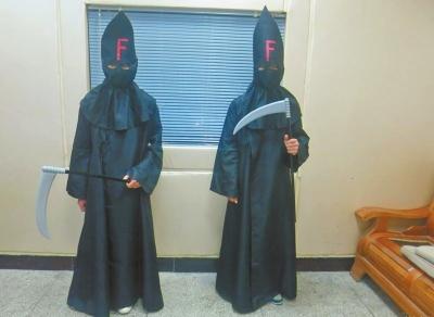 经查,两名蒙面人均为准高中生,酷爱动漫真人秀,专程从网上购买了动漫人物的服装及装备。拿到货之后他们就穿好服装、戴上头罩、手持仿真镰刀到县城南岭公园转悠,被群众认为是恐怖分子并报警。