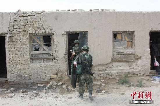 新疆乌什县群众自发参与的大围捕每天都在进行,群众配合民警对重点搜捕区域的以及耕地林带、水渠坟地等每个角落展开了拉网式大清查,每天正常搜捕的武警、警察、民兵都在上千人,两名逃犯至今已经一个月余。图为8月10日民兵及武警特警在个废弃房子搜捕逃逸暴徒。陶拴科 摄