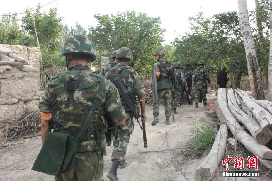 新疆乌什县群众自发参与的大围捕每天都在进行,群众配合民警对重点搜捕区域的以及耕地林带、水渠坟地等每个角落展开了拉网式大清查,每天正常搜捕的武警、警察、民兵都在上千人,两名逃犯至今已经一个月余。图为村民带领武警官兵在村庄进行搜捕。陶拴科 摄