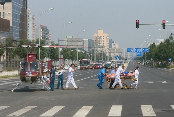 8月14日下午,北京安贞路口,一架直升机平稳降落,北京急救、空管、交管等多个部门联合开辟绿色通道,将机上搭载的急性心梗患者岳先生送往安贞医院接受治疗。据介绍,岳先生从新疆被转运来京,因飞行距离远,此次用了两架飞机接力转运,整个运费高达50万元。