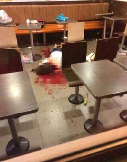 2014年5月28日21时许,张立冬等6人(其中一人未成年)在山东招远一麦当劳快餐店内就餐时,与同在该店就餐的女子吴某发生口角。后张立冬等6人对吴某进行殴打,致吴某受伤,后经抢救无效死亡。图为案发现场。
