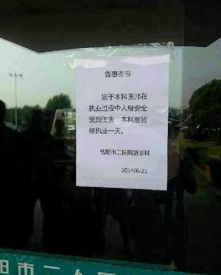 岳阳市二人民医院门口贴出的告示。根据通报,8月21日下午3:00前,所有集访医务人员已全部离开市政府,目前,岳阳市公安局已成立伤医专案组,岳阳市卫生局调集了8名专家启动医疗事故调查,进一步明确是非与责任。