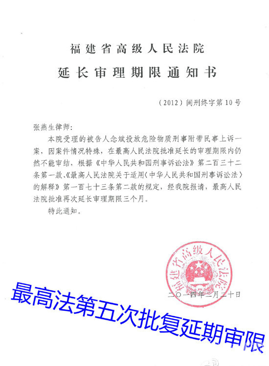 第三次进入二审程序后,福建省高院数次延期审理,迟迟未判。在最高法两次批准延期审理之后,福建省高院才于2013年7月第一次开庭。