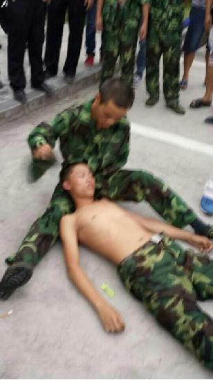 8月24日,有网络消息称湖南龙山县皇仓中学在新生军训时,教官和师生发生冲突,导致多名学生和教师受伤,部分重伤。图为在网上广泛流传的教官和学生发生冲突的照片。
