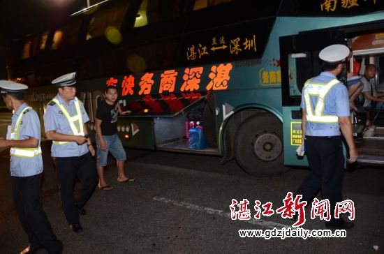 赤坎交警设立临时执勤点,对客车和危化品车辆逢车必查。