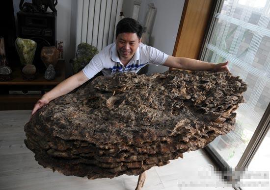 河北石家庄市市民崔联平在太行山游玩时,发现一棵直径达1.38米、重量约150斤的野生灵芝。专家鉴定后表示,这是灵芝中的上品云芝,如此硕大的云芝在北方相当罕见。图为崔联平张开双臂,向记者展示野生灵芝的直径长度。
