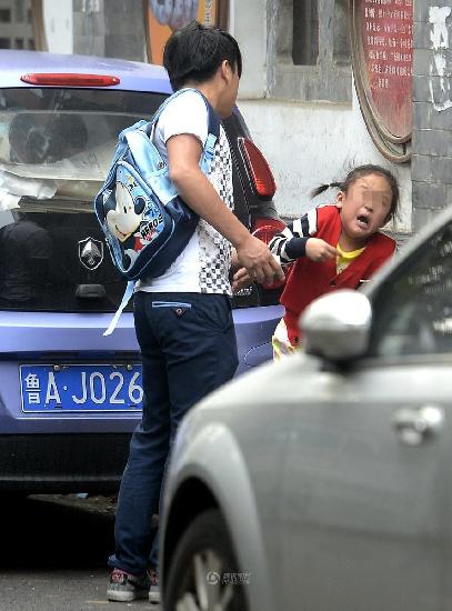 女孩家长随即将其领到偏僻处,抬脚踹向孩子大腿处,并抬手连扇女儿三个耳光。