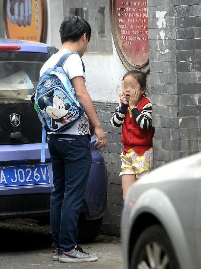 女孩被打之后双手捂着通红的脸蛋,停止了哭泣。