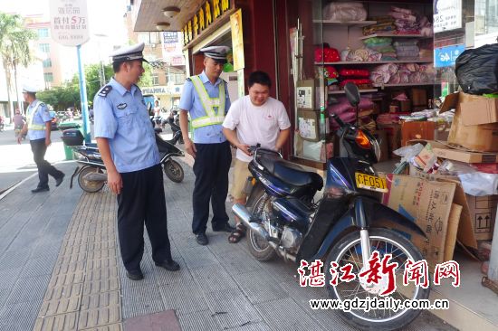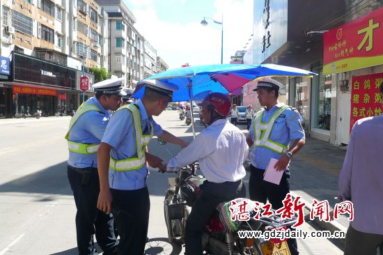 在行动中,伍生保、李一通副大队长亲自带领两个行动小组,采取定点检查与机动巡逻相结合的方法,分别在廉江大道、中山路、人民大道、环市路、五一路等繁华街道开展整治行动。执法民警本着“以民为本,服务为先”的执法理念,教育劝导市民群众文明出行,规范有序停放车辆,并在指挥疏导城区交通秩序中,纠正、教育、处罚各类道路交通违法行为,重点整治各类无牌无证、假牌假证、三轮摩托车和乱停乱放,冲红灯,逆向行驶,不按车道行驶,违规变道掉头和摩托车不戴安全头盔、超员,加装太阳伞等严重交通违法行为。