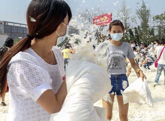 烟台千人“枕头大战”迎中秋 美女帅哥齐上阵