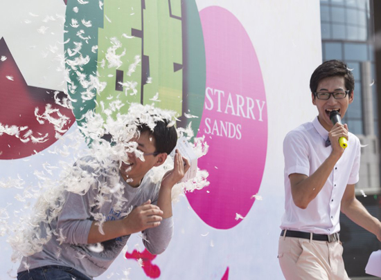 烟台千人“枕头大战”迎中秋 美女帅哥齐上阵