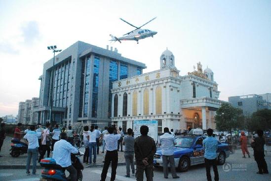 2014年9月6日傍晚6点左右,一架直升机在盐城大丰市区上空盘旋几圈后,降落在江苏盐城大丰市和平饭店门口,引来周围居民的围观。记者了解到,这是大丰市一位在外地经商的老板的私人飞机,他当天从天津坐该机回老家过中秋节。