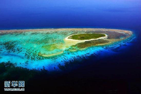 从空中俯瞰西沙,仿佛来到了人间仙境:湛蓝的天空中飘着朵朵白云,机翼下的座座岛屿犹如迷人的翡翠,镶嵌在蔚蓝色的海面上。西沙的海水清澈透明,能看清楚水下40多米珊瑚礁盘的形态和纹理。礁盘最浅的地方呈淡绿色,随着海水的深度变化,色彩也由浅绿向深蓝过度,成为一幅五彩缤纷的巨幅油画。图为西沙晋卿岛犹如一条热带鱼,色彩斑斓。
