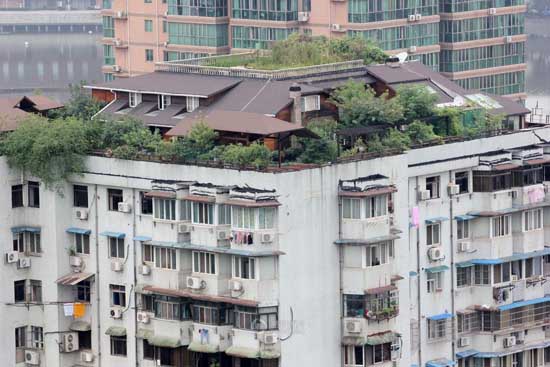 2014年9月13日,湖北武汉,一栋12层居民楼顶藏着两层楼的“空中花园”。看着像是别墅,墙体上装有窗户和烟囱,四周则种有不少花草,设有鱼池。