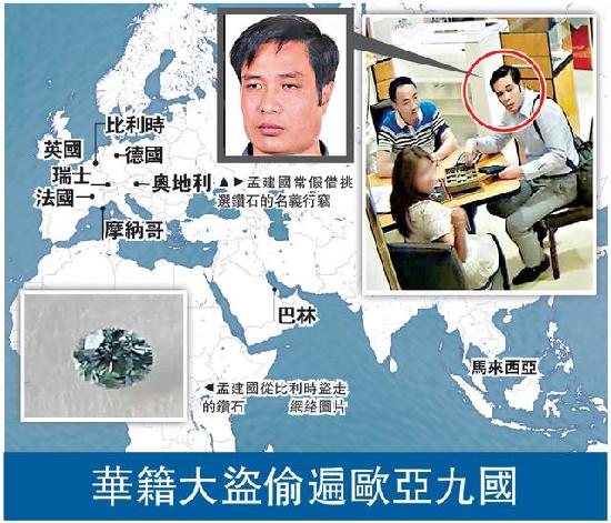 据大公报消息,国际刑警组织13日证实,涉嫌偷遍世界各地,作案价值达到数百万美元的中国籍珠宝大盗孟建国(Jianguo Meng,译音),在瑞士苏黎世犯案时落网。据国际刑警组织发布的消息,孟建国涉嫌在9个国家犯案14起,盗窃了价值数百万美元的珠宝。