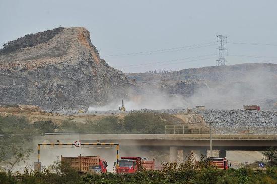 图为众多重型卡车在辽宁省大连新机场附近被开采的山上拉土石方填海。 据媒体2013年8月报道称,这个造价数百亿的新机场不仅没有填海手续,立项都未获批。按规定,我国填海建设的机场项目审批流程是首先须由国家发改委正式审批通过,再经国家环保部环境影响评价审批和国家海洋局海洋环境影响评价审批。新机场的填海工程开始于2012年3月20日,但项目部工作人员和附近村民告诉记者这里在2011年就已开始填海施工。