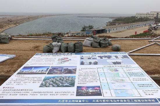 9月14日,在辽宁省大连新机场建设工地沿岸的地上摆放的大连新机场商务区下一步工作计划图。据悉,在紧邻渤海海岸线的一侧,短短30公里的范围内,密集排列着包括大连金洲湾海上新机场、周水子国际机场及土城子、黄龙尾军用机场在内的四个机场。而整个大连市包括所有的军用机场在内,更是总计有多达10个机场。专家称,军用机场和其他机场密集存在使得空域特别拥挤,安全令人担忧,因天气因素备降其他机场也不太可能。