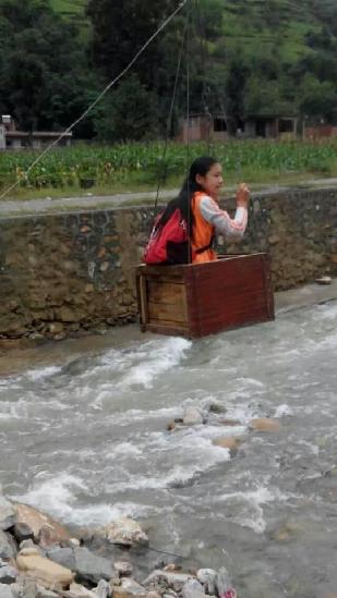 图为山阳县板岩镇北沟寺村4组的学生通过自制的简易缆车过河上学。