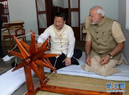 当天下午,习近平在莫迪陪同下参观甘地故居。红瓦白墙,绿树成荫,印度少年在草坪上吟唱甘地名言。习近平身穿莫迪赠送的印度传统夹克抵达甘地故居,莫迪向前迎接。在甘地图片展室,莫迪向习近平介绍甘地生活和斗争经历。习近平向甘地铜像敬撒花瓣。在甘地居室,莫迪介绍了甘地清贫简朴的生活方式,向习近平赠送象征着“甘地主义”和平勤劳精神的手纺棉纱条。习近平按照当地习惯,将棉纱条挂在甘地画像前,表示敬意。习近平亲自摇动甘地曾经使用过的纺车。莫迪向习近平赠送关于甘地的书籍和当年南非华人支持甘地的海报。习近平指出,中印两国人民在反对殖民主义、争取民族独立的斗争中相互同情、相互支持,结下深厚友情。我们要把它传承下去,发扬光大。